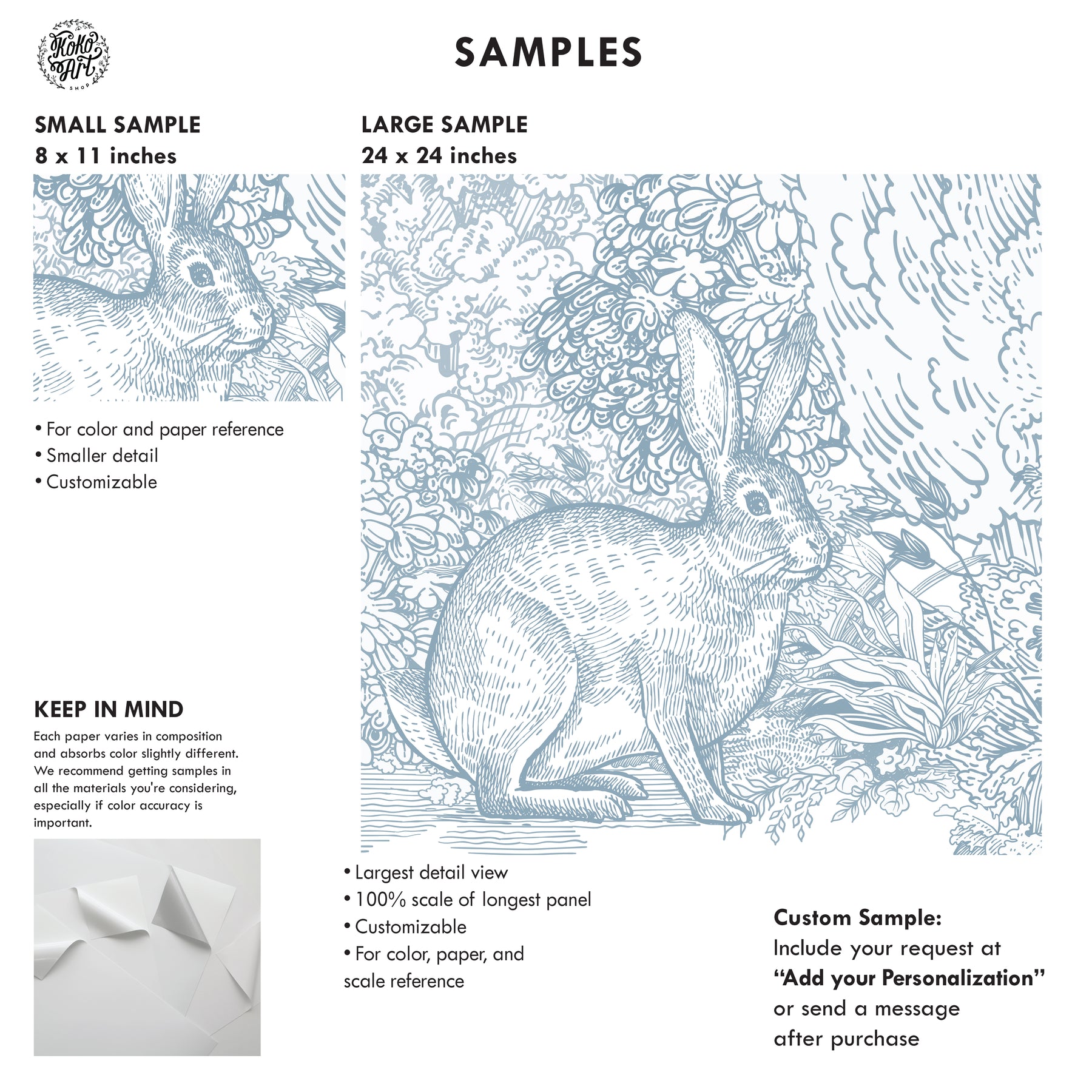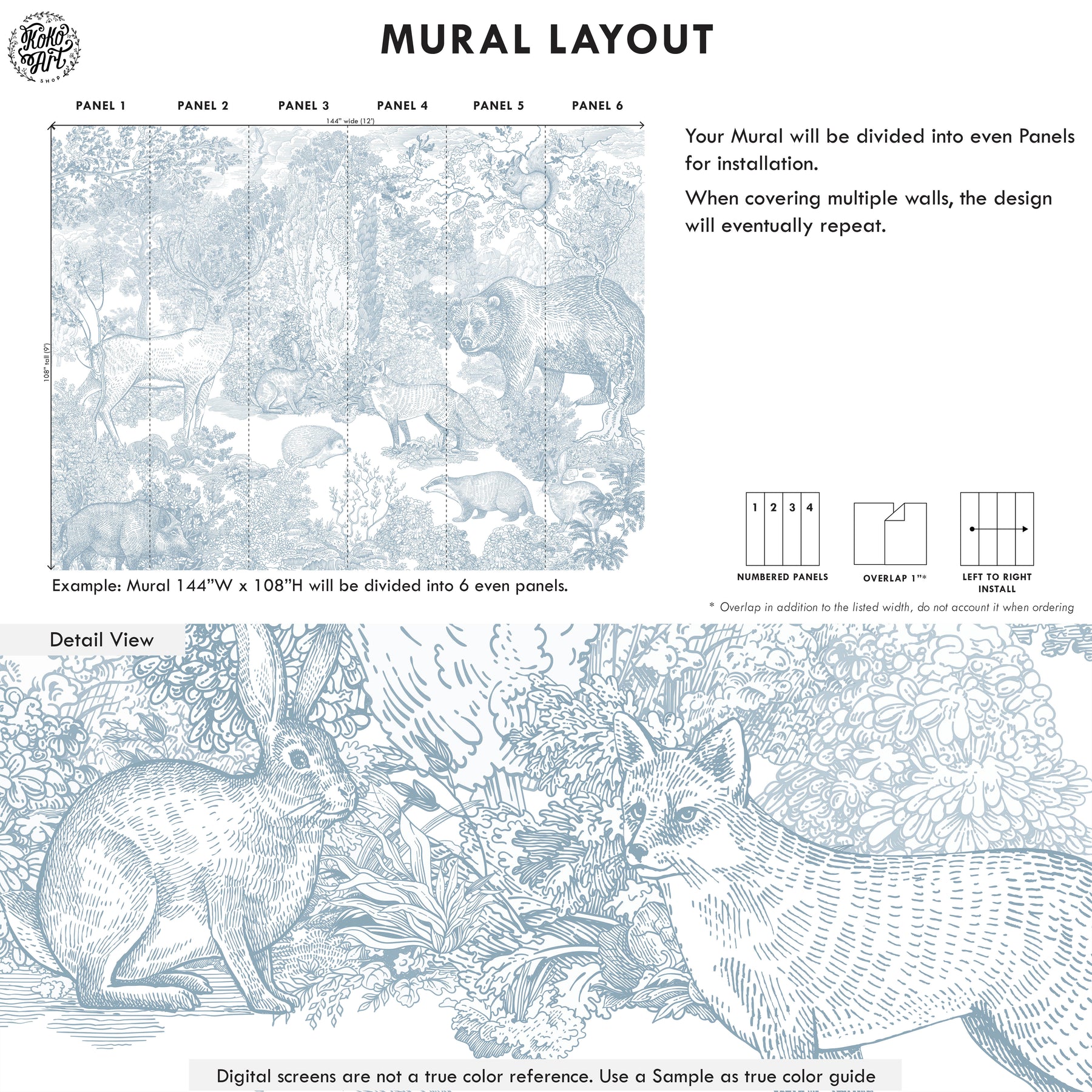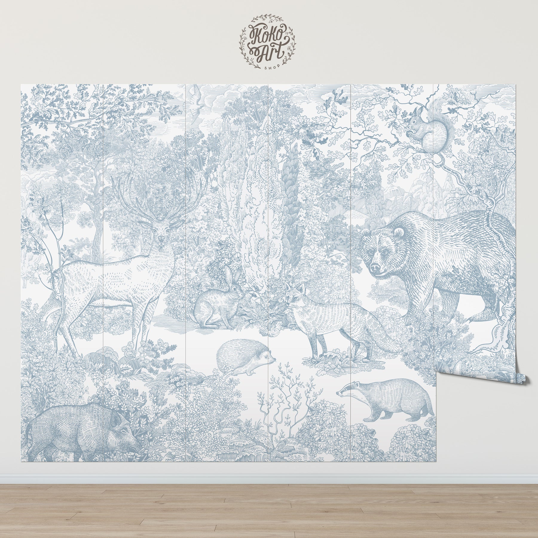 Create a calming atmosphere with the Timeless Forest Wallpaper Mural in Blue. This classic piece features an antique woodland scene with charming animals such as bears, deer, squirrels, foxes, rabbits, and wild boar. The soothing blue tones add a touch of sophistication, making this mural perfect for any space.