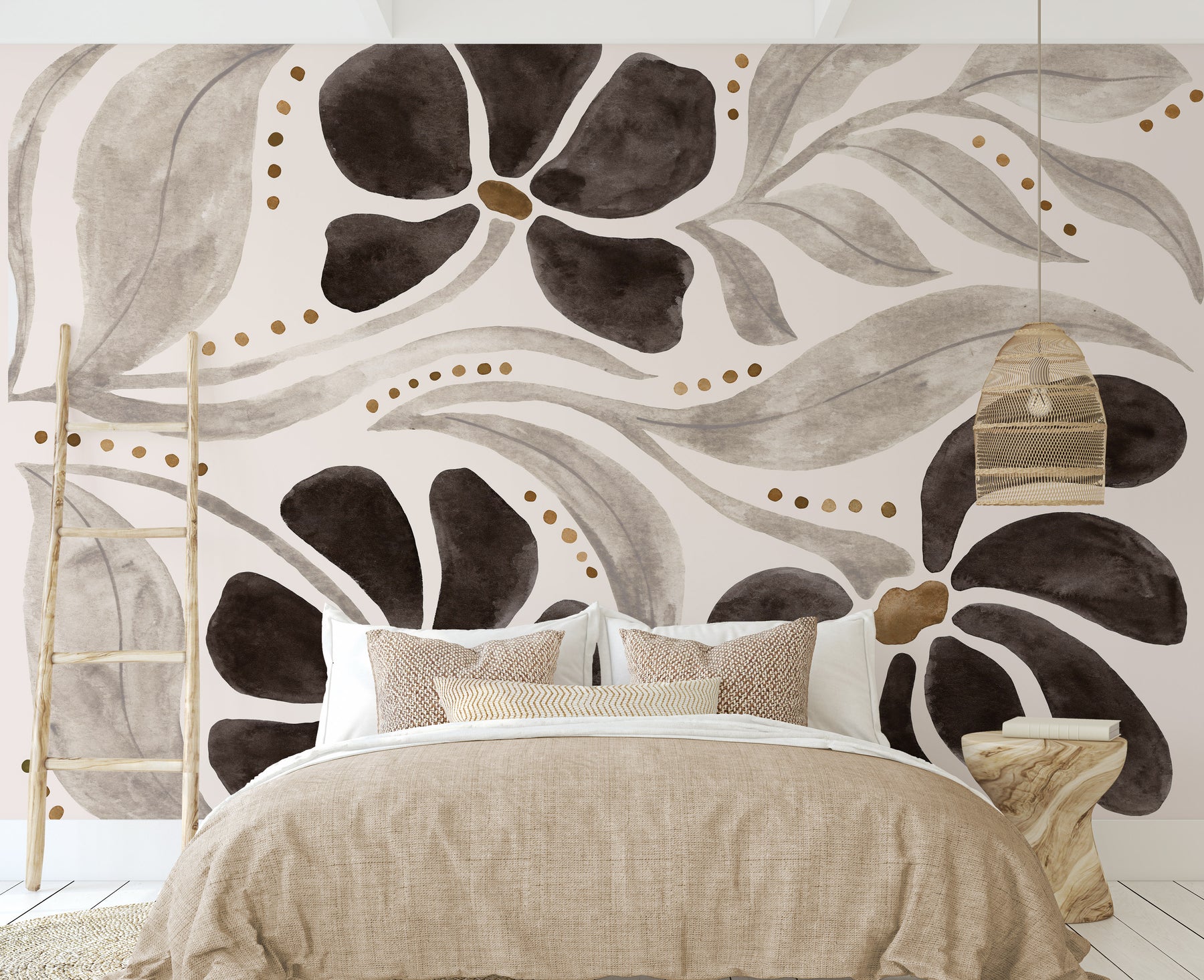 Bring modern elegance to your space with Minimal Bloom in Big Scale Mural. This large-scale floral wallpaper features hand-painted petals and leaves in soft neutral tones of charcoal, taupe, and beige. The simple watercolor design offers a calm yet bold statement, perfect for minimalist, modern, or Japandi-inspired interiors.