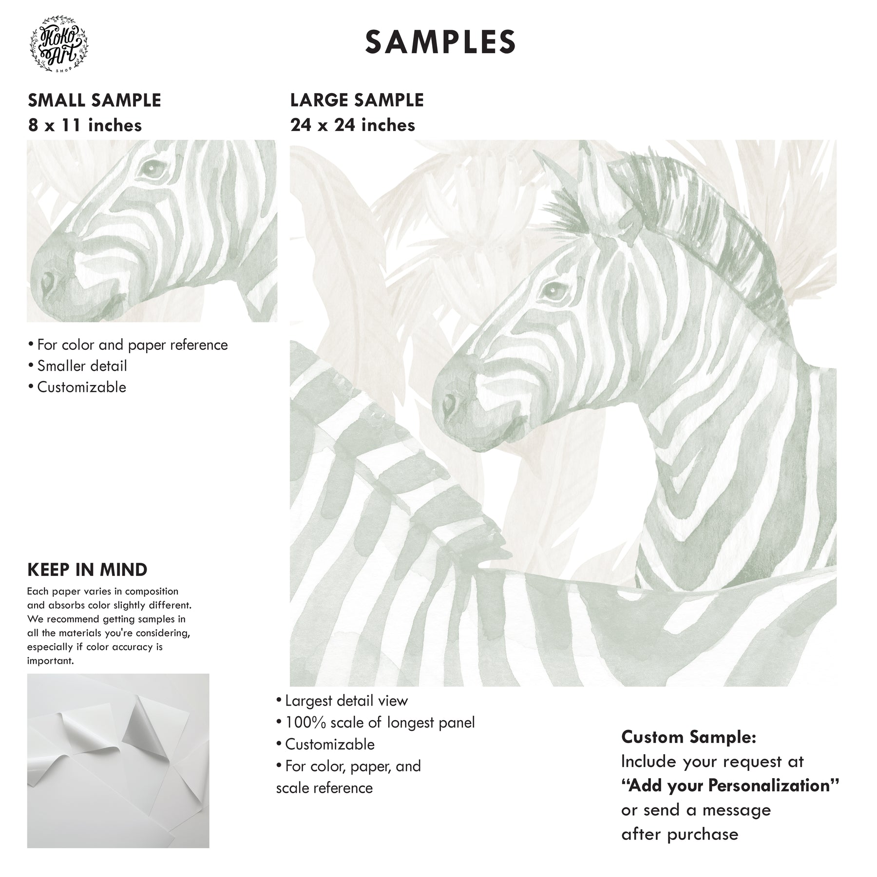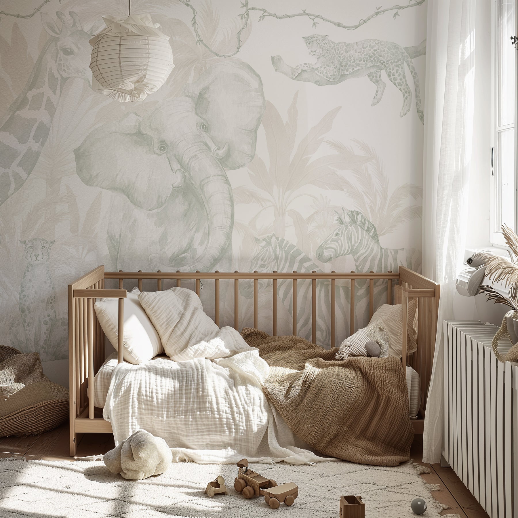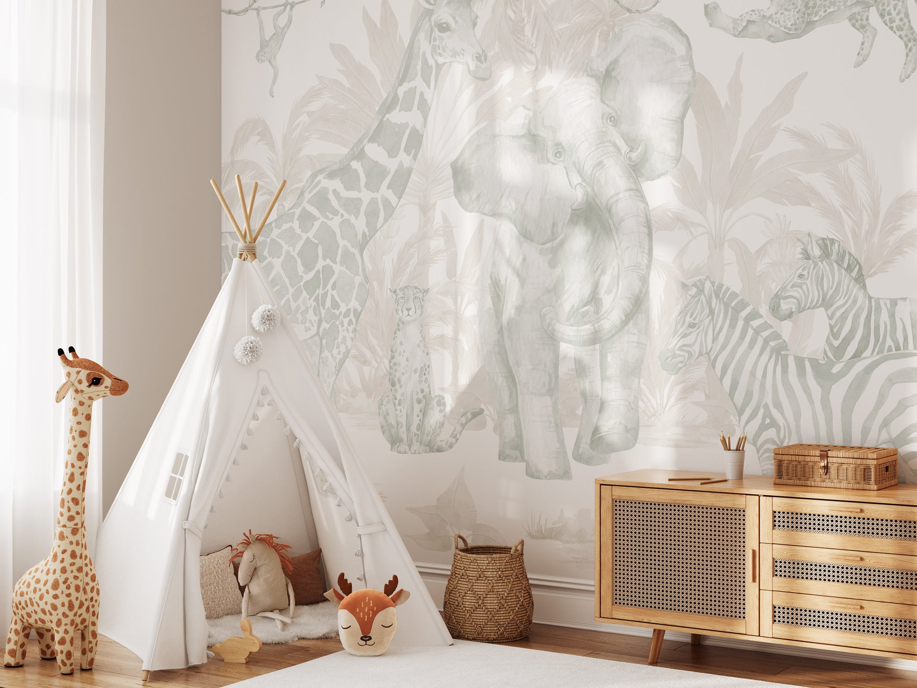 This elegant safari mural features graceful wildlife illustrated in soothing shades of sage green and warm beige, creating a calm and refined take on a classic safari theme. Softly layered giraffes, elephants, zebras, and leopards are surrounded by airy foliage, giving the design a light, watercolor feel that blends beautifully into the wall rather than overpowering it. Perfect for gender-neutral nurseries or girls’ bedrooms, this mural brings a peaceful, nature-inspired atmosphere that feels timeless, modern, and effortlessly soothing, pairing seamlessly with natural woods, soft linens, and neutral décor.