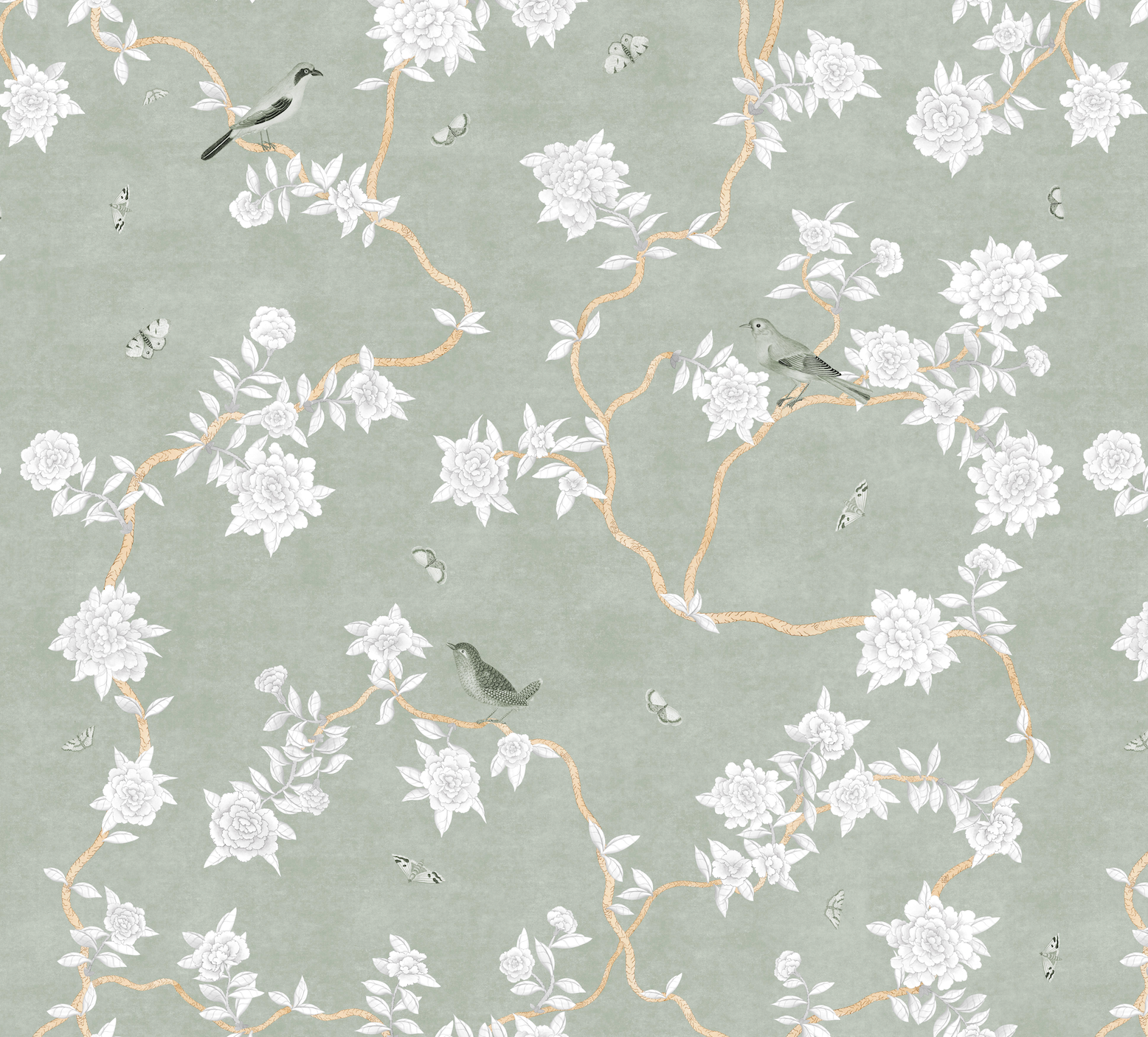L’Atelier Botanique Chinoiserie Revival Wallpaper Mural in Sage Meadow