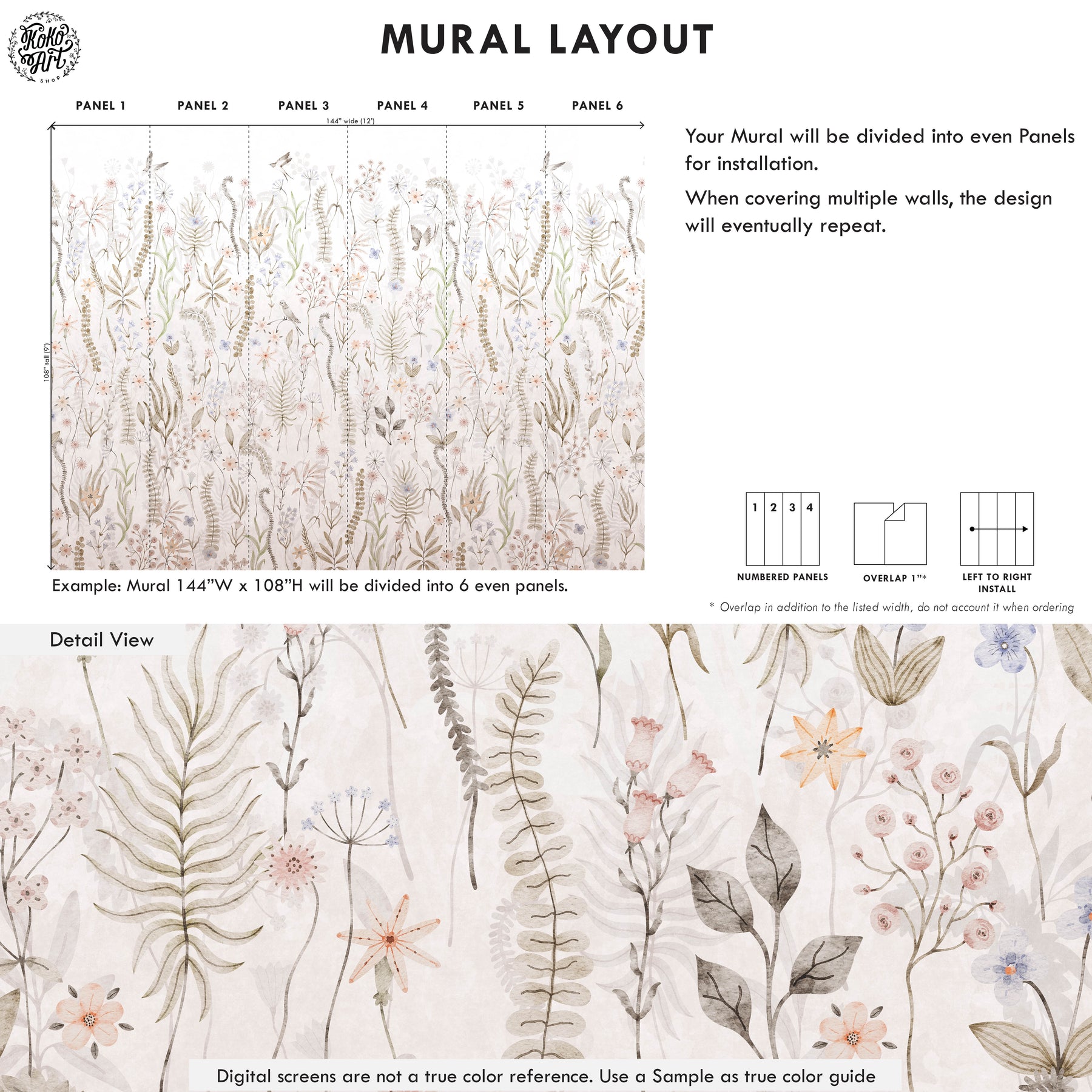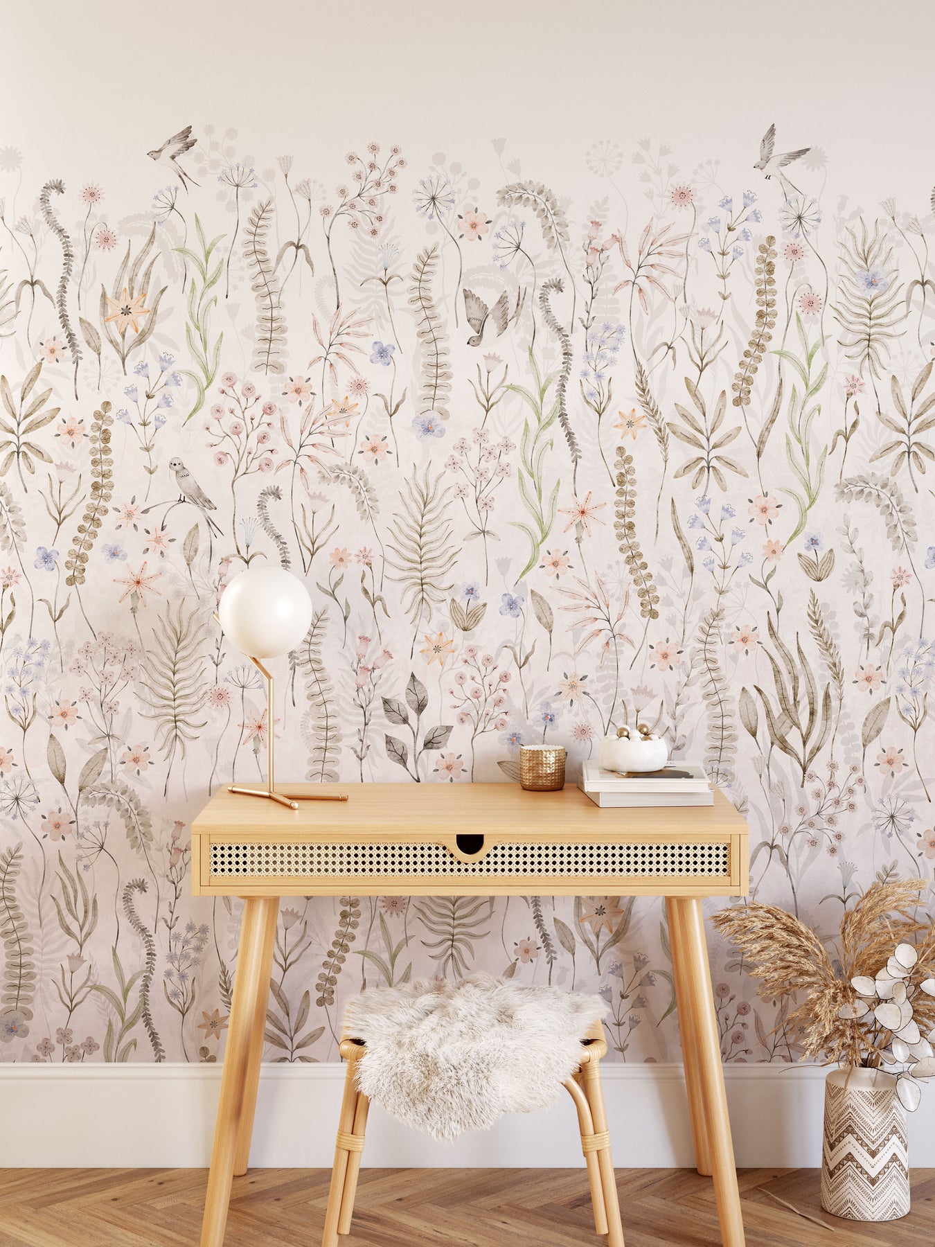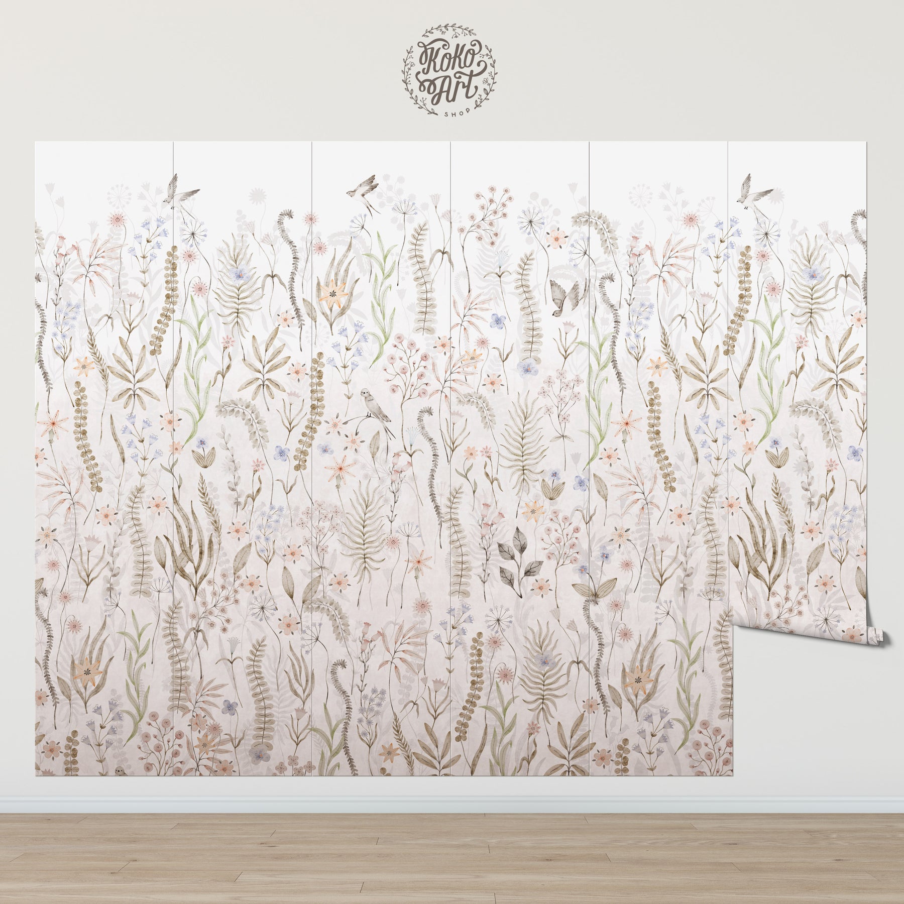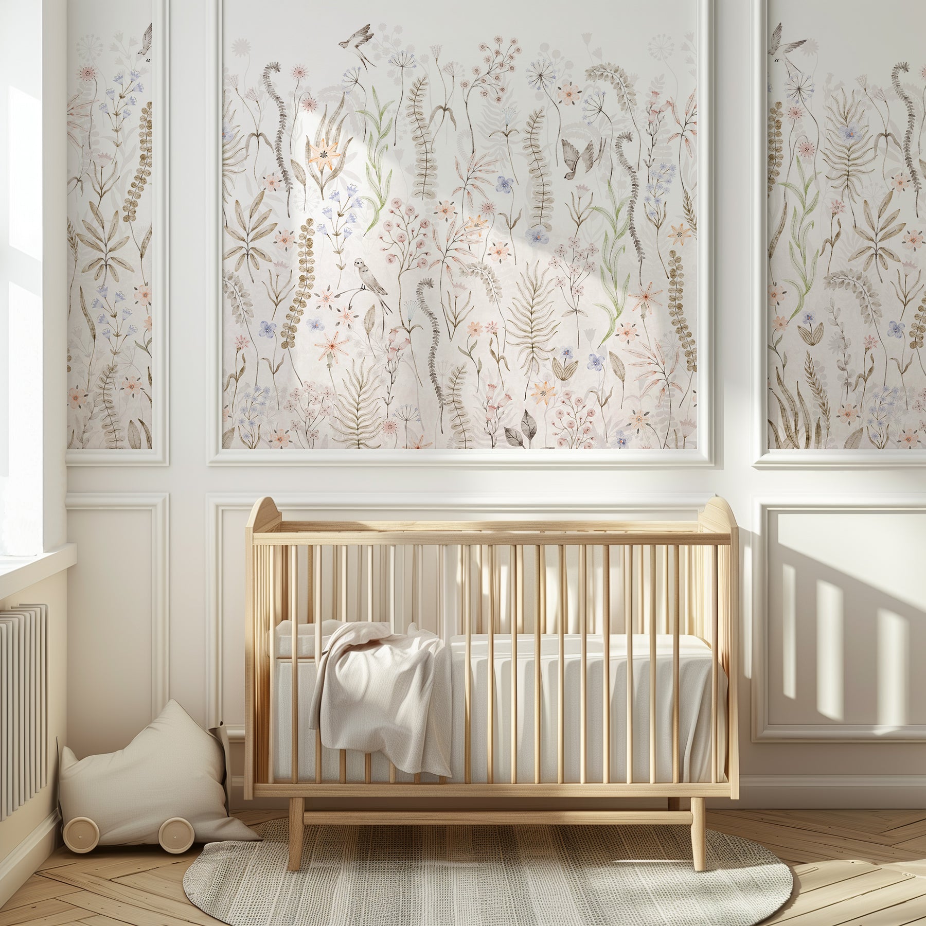 Created for those who love a neutral foundation but still want gentle movement and visual interest, this mural offers a refined alternative to traditional florals. It pairs beautifully with beige, cream, greige, linen, and natural wood tones, making it ideal for nurseries, children’s rooms, or any calm, nature-inspired interior.