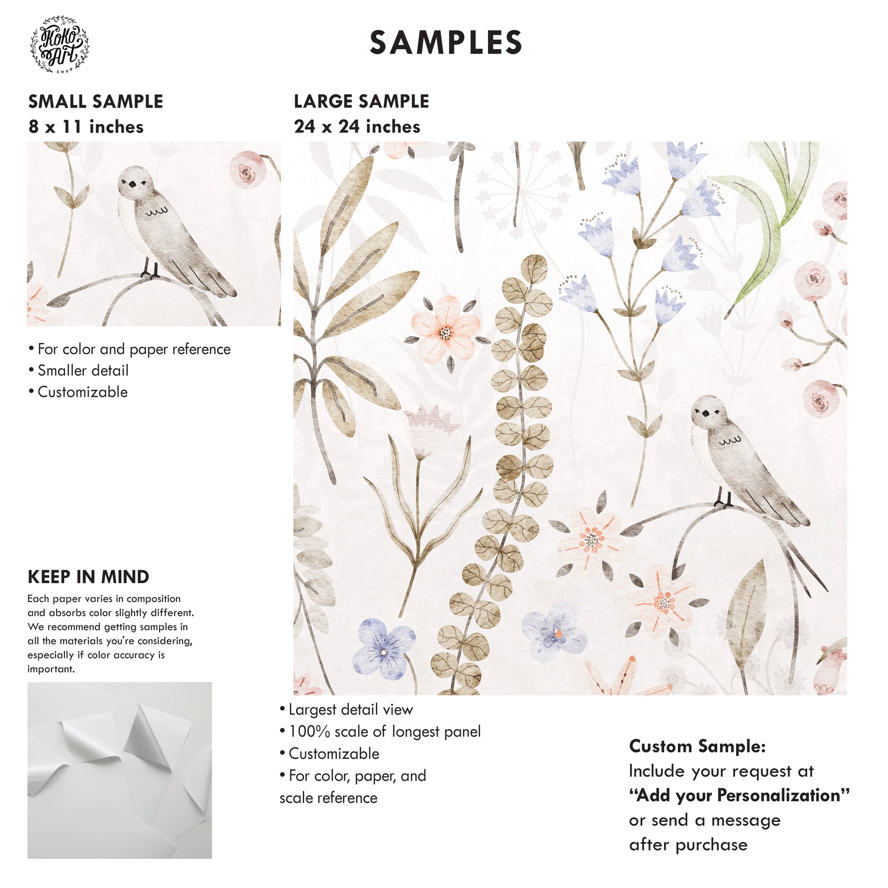 Delicate wildflowers and botanicals painted in a washed, fog-kissed palette of warm neutrals with subtle hints of blush, sage, and soft blue. The result is an unconventional floral that feels airy, organic, and timeless rather than bold or overly themed.
