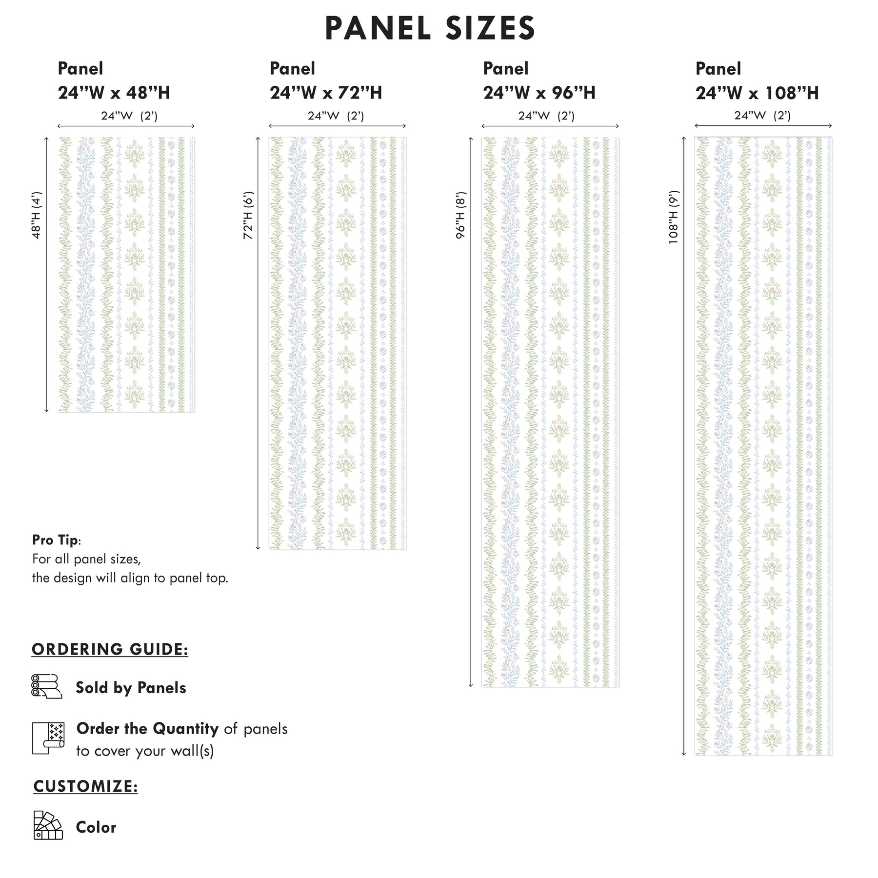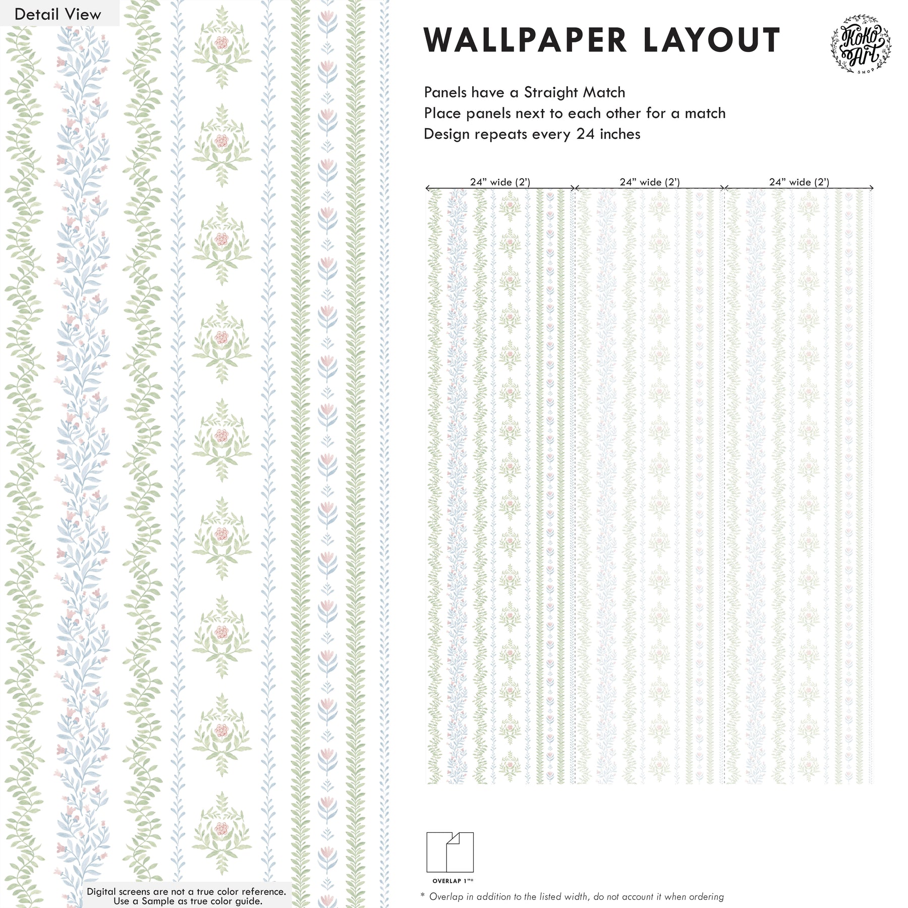 • This design has a straight match, and repeats every 24 inches.