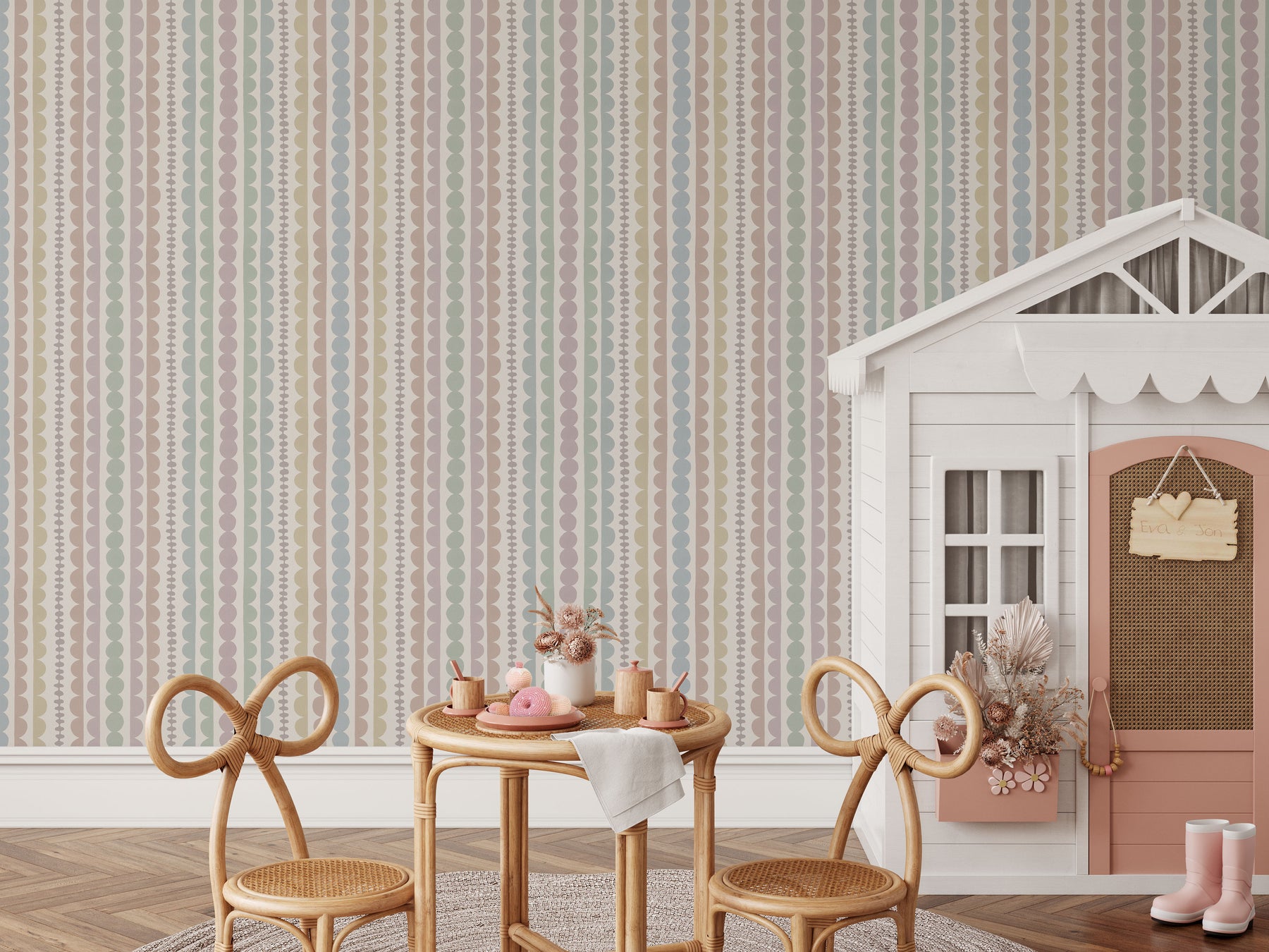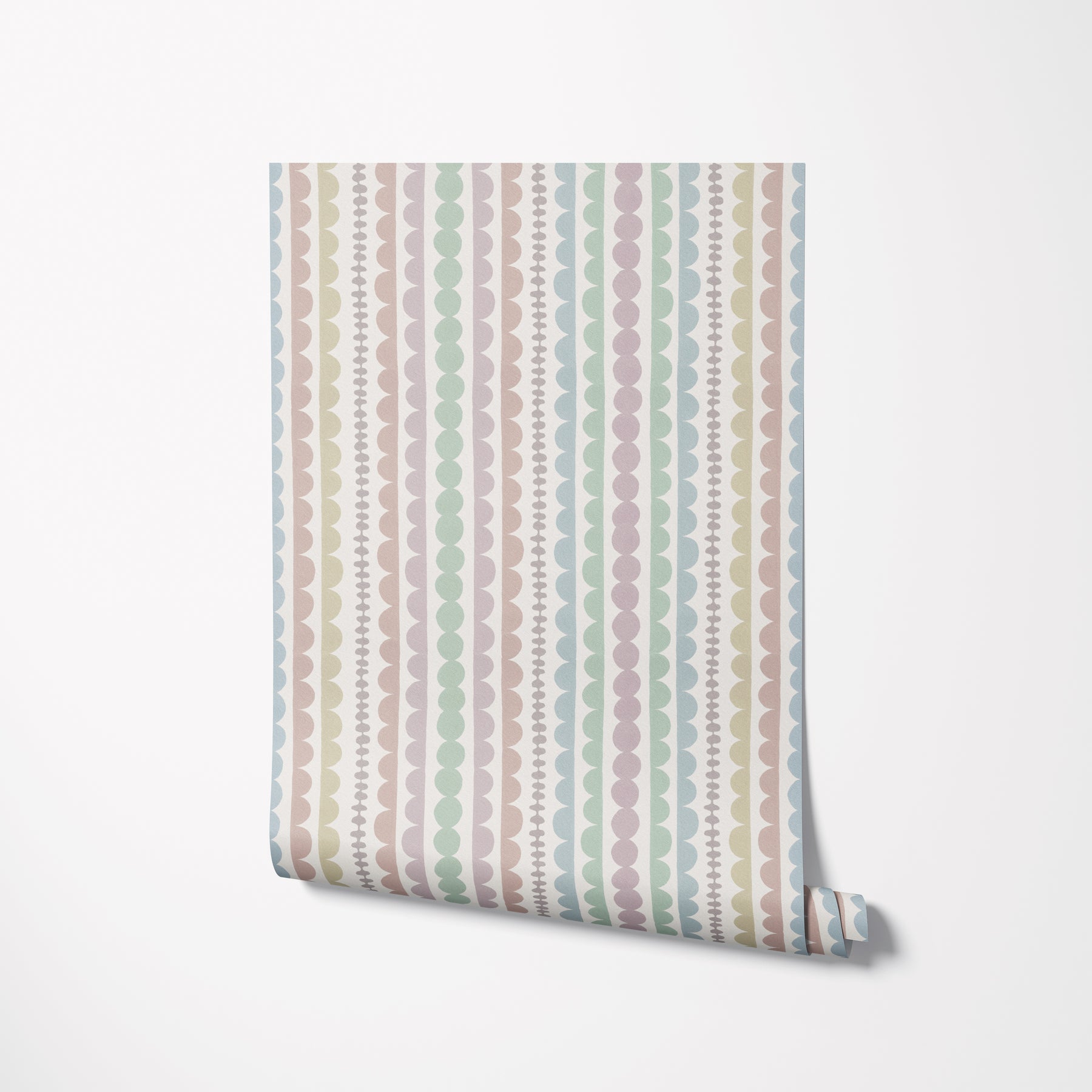 Bring gentle rhythm and soft color into your child’s space with this modern Pebble Ribbon Stripe Wallpaper. Featuring vertical rows of watercolor pebbles and delicate ribbon-like lines in soothing pastel tones, this design creates a playful yet calming atmosphere perfect for nurseries, playrooms, and growing kids’ spaces.