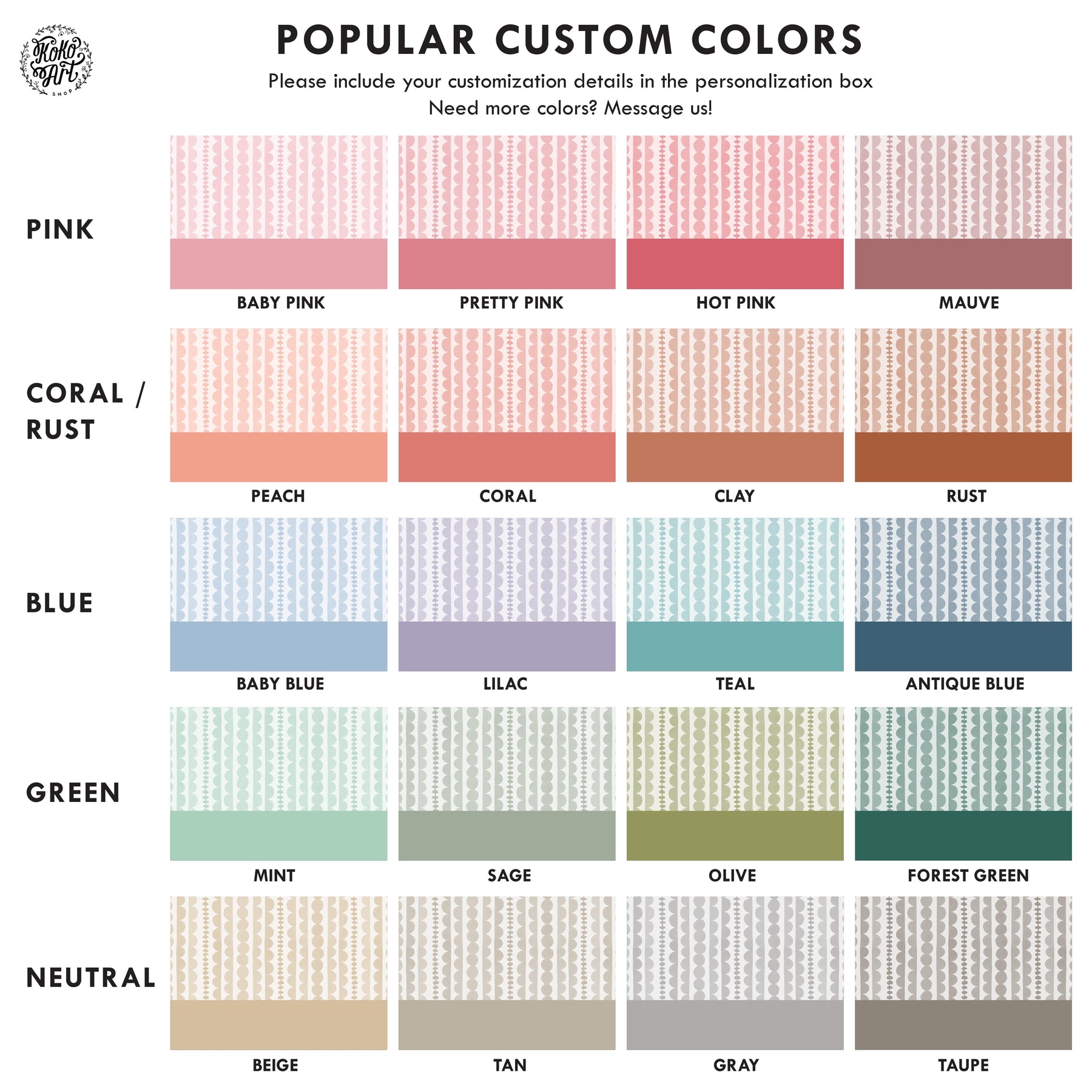 When requesting color changes, use our Color Chart for additional tones.