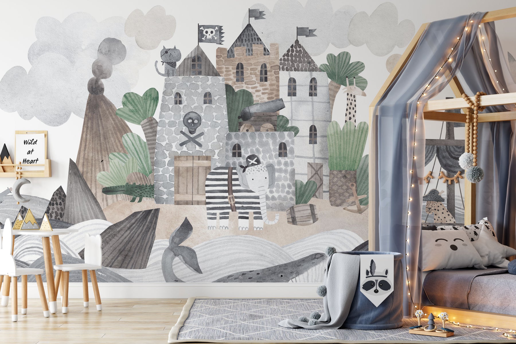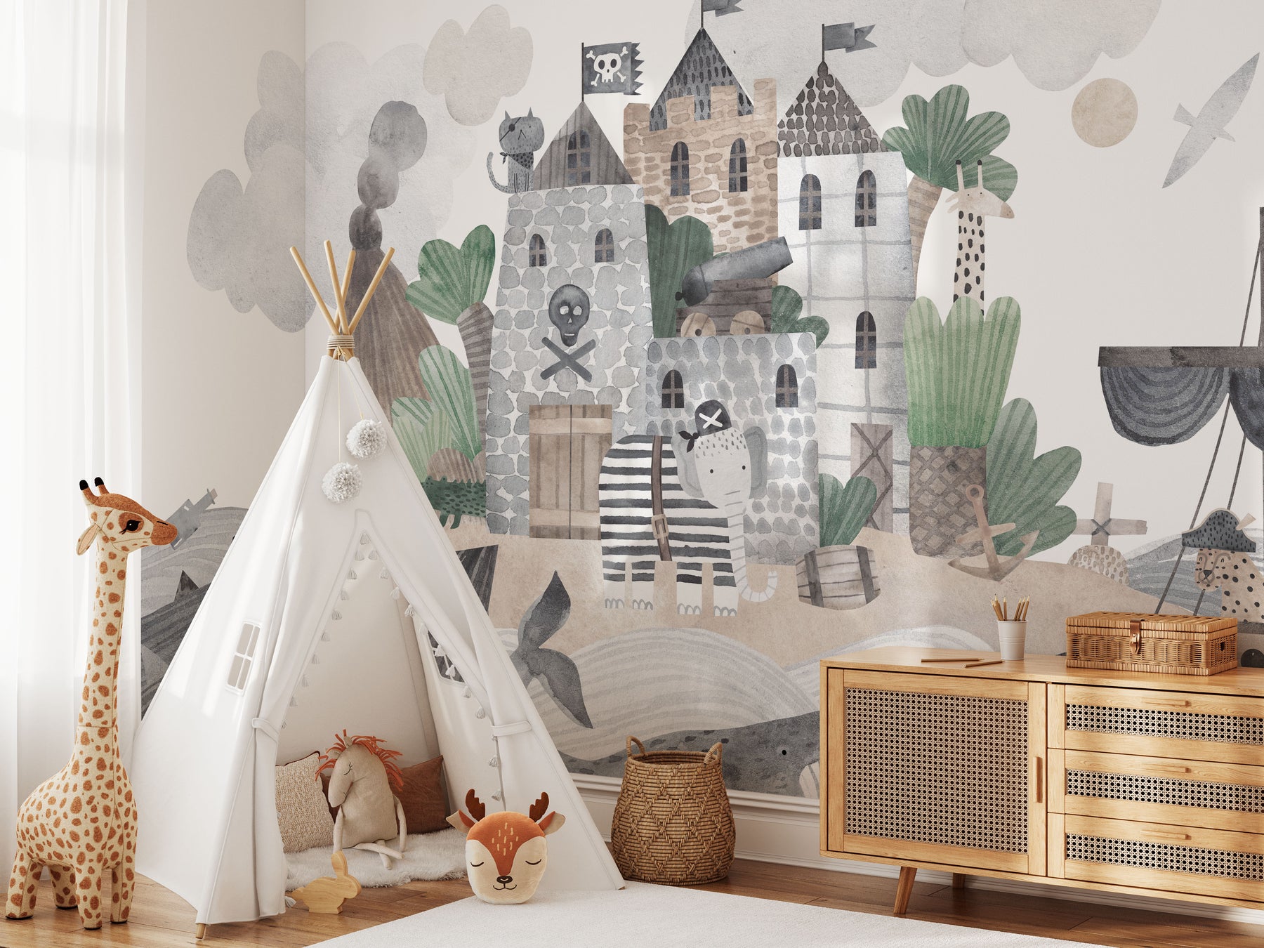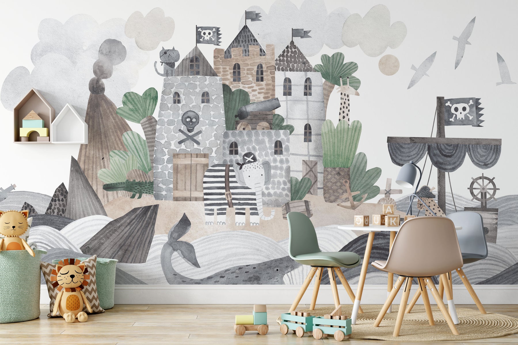Hoist the sails and set off on an epic adventure! This pirate mural bursts with playful sea creatures and daring exploration, inspiring young buccaneers to embrace courage and curiosity. Perfect for kids ready to grow beyond the nursery, it captures the thrill of discovery with charming animal companions navigating the high seas. Transform any room into a swashbuckling hideaway where imagination rules the waves.