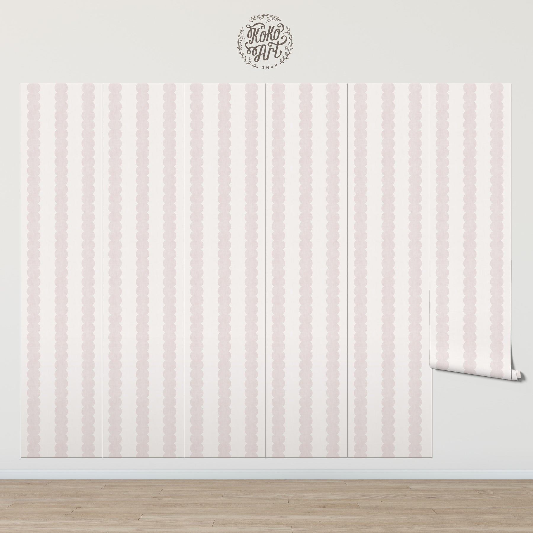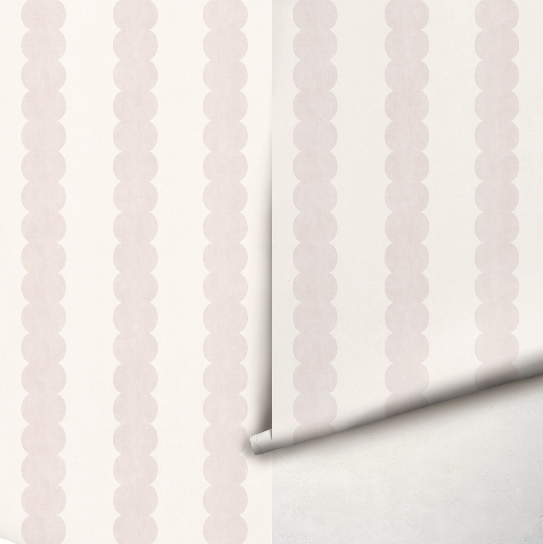 A modern, bold wallpaper featuring a minimal pebble-column design. Each panel is styled with three thick vertical stripes for a strong yet refined statement. Colors are Antique Pink and Off White.