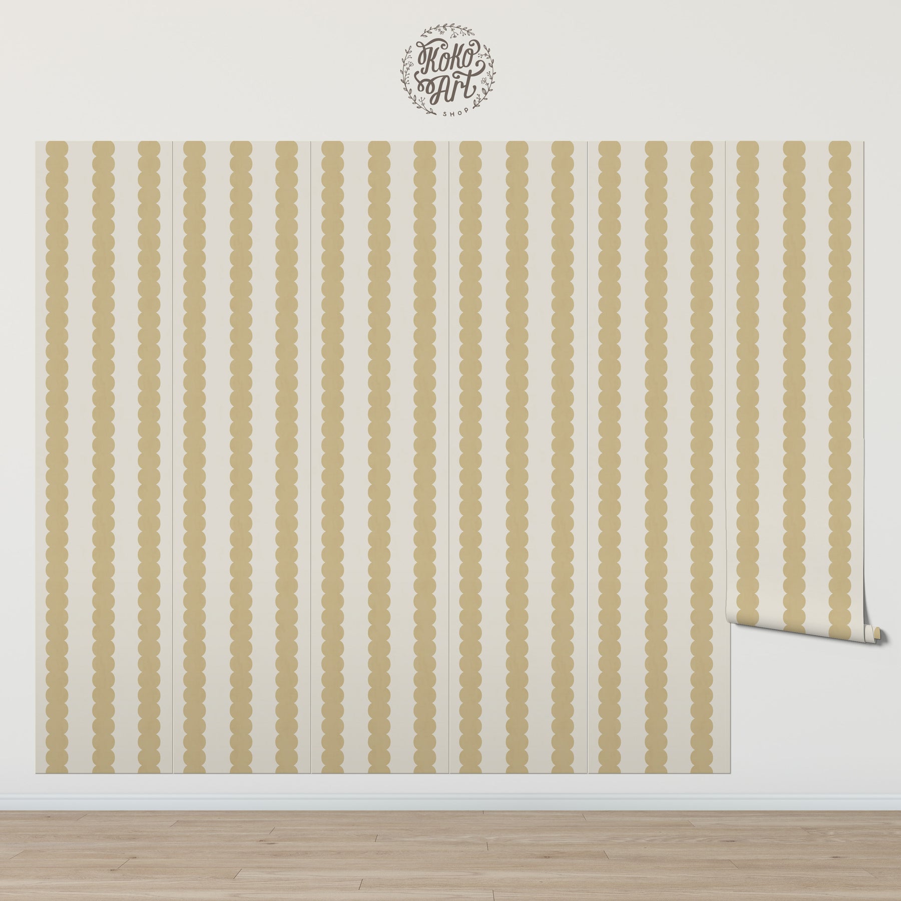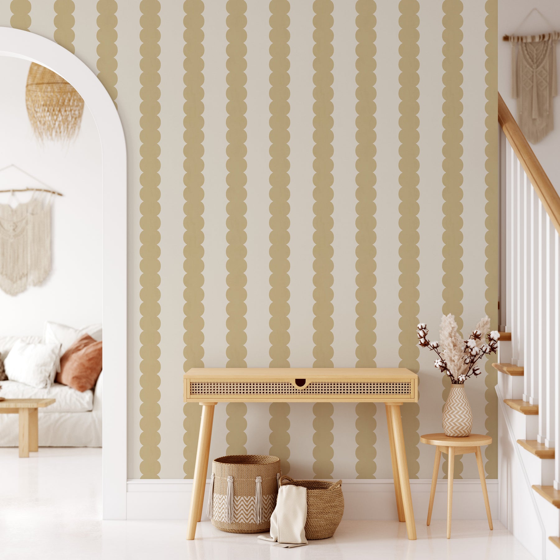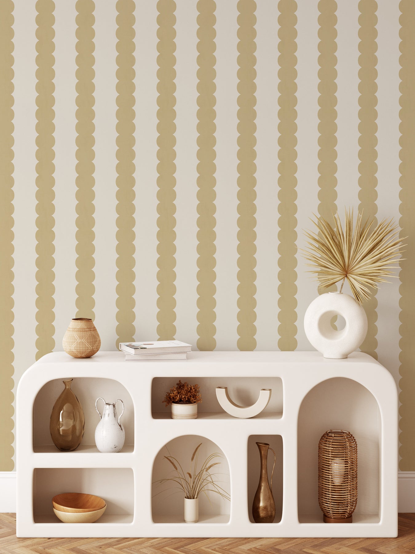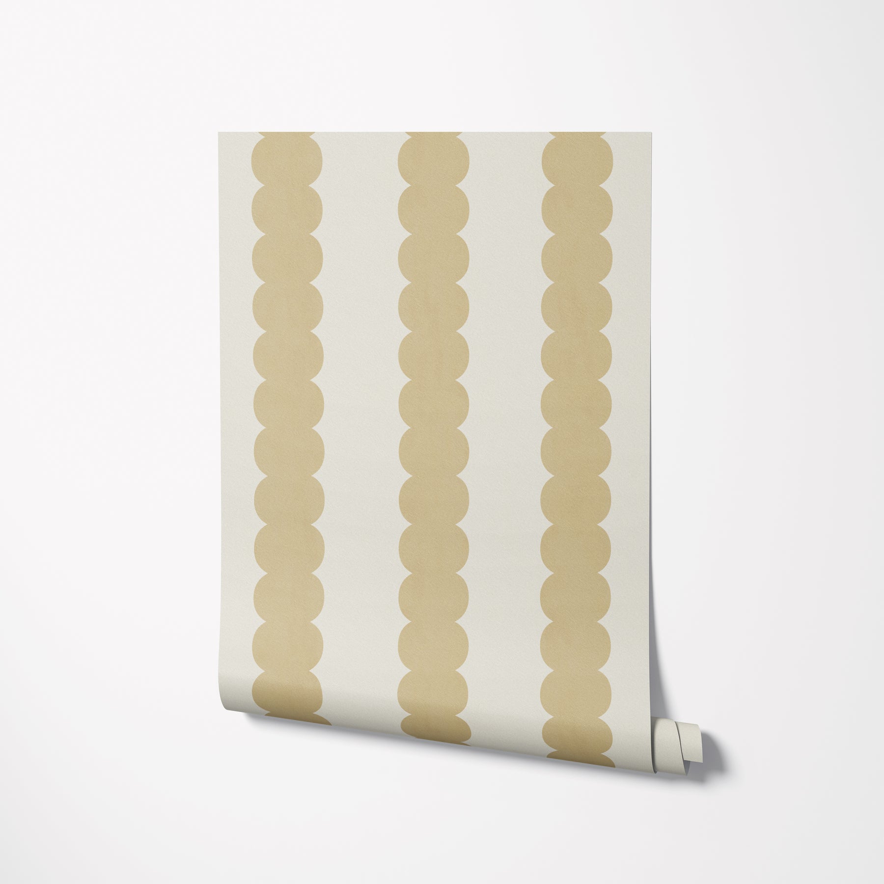 A modern, bold wallpaper featuring a minimal pebble-column design. Each panel is styled with three thick vertical stripes for a strong yet refined statement. Colors are Mustard and Light Cream.