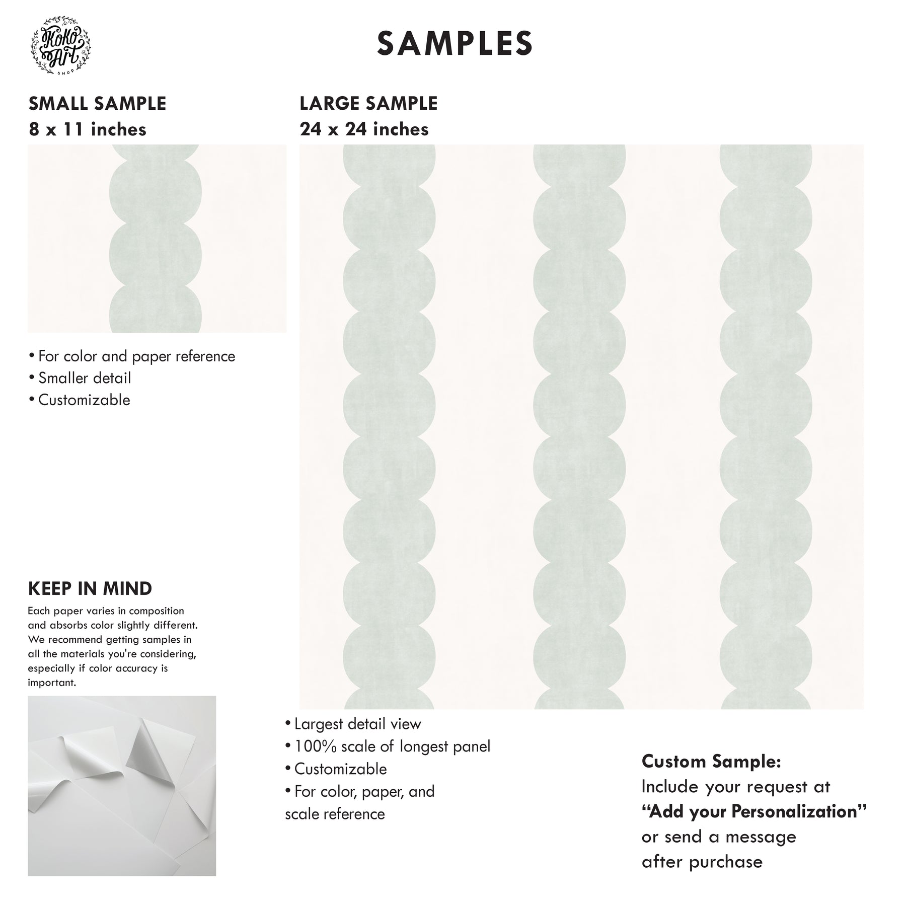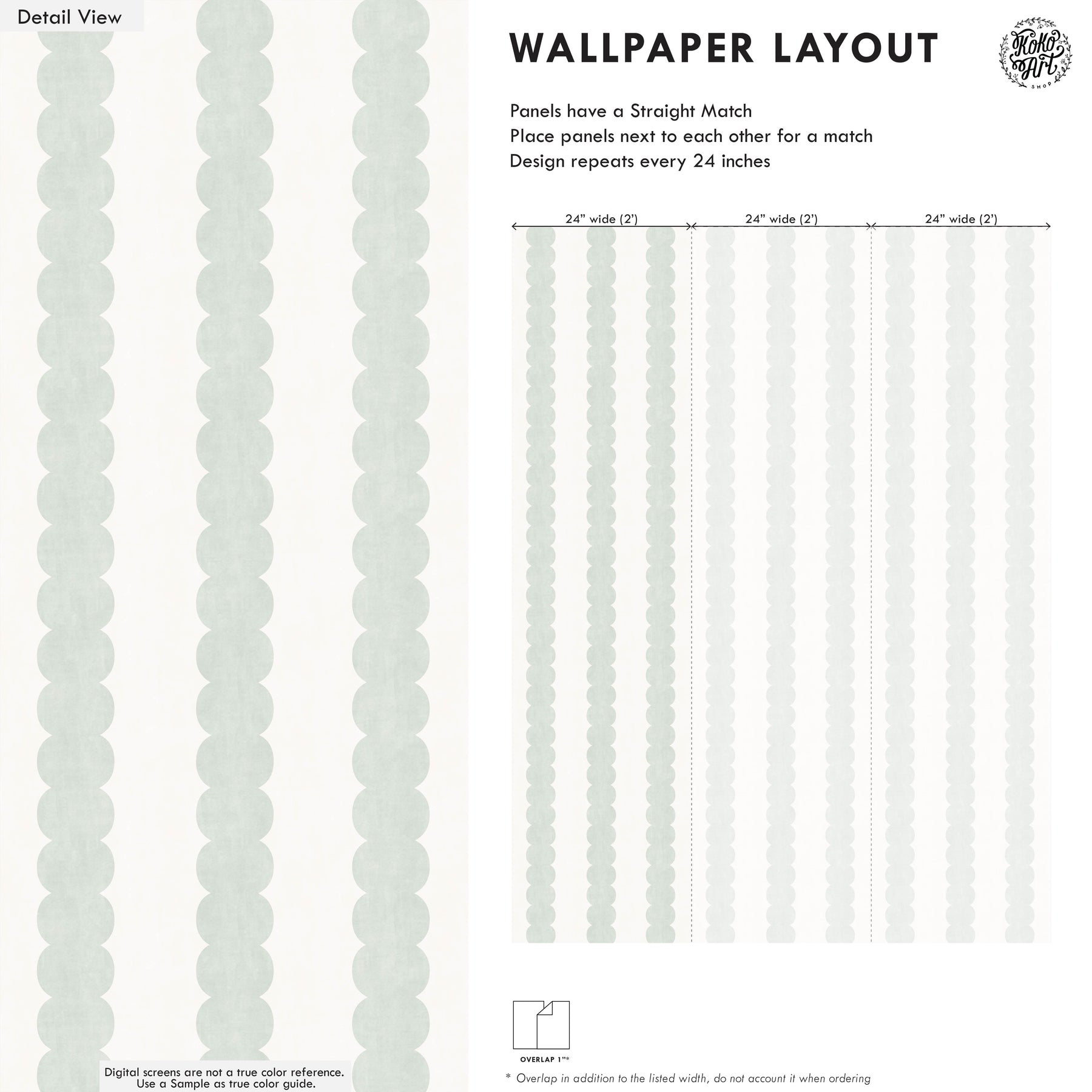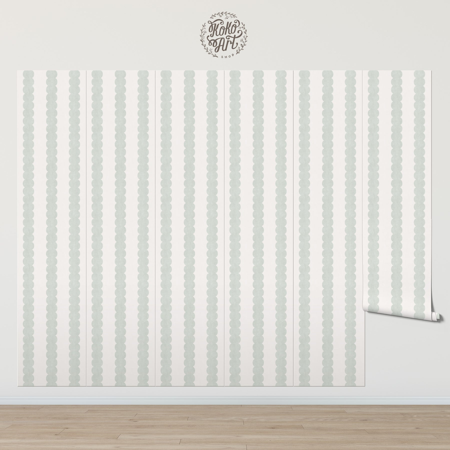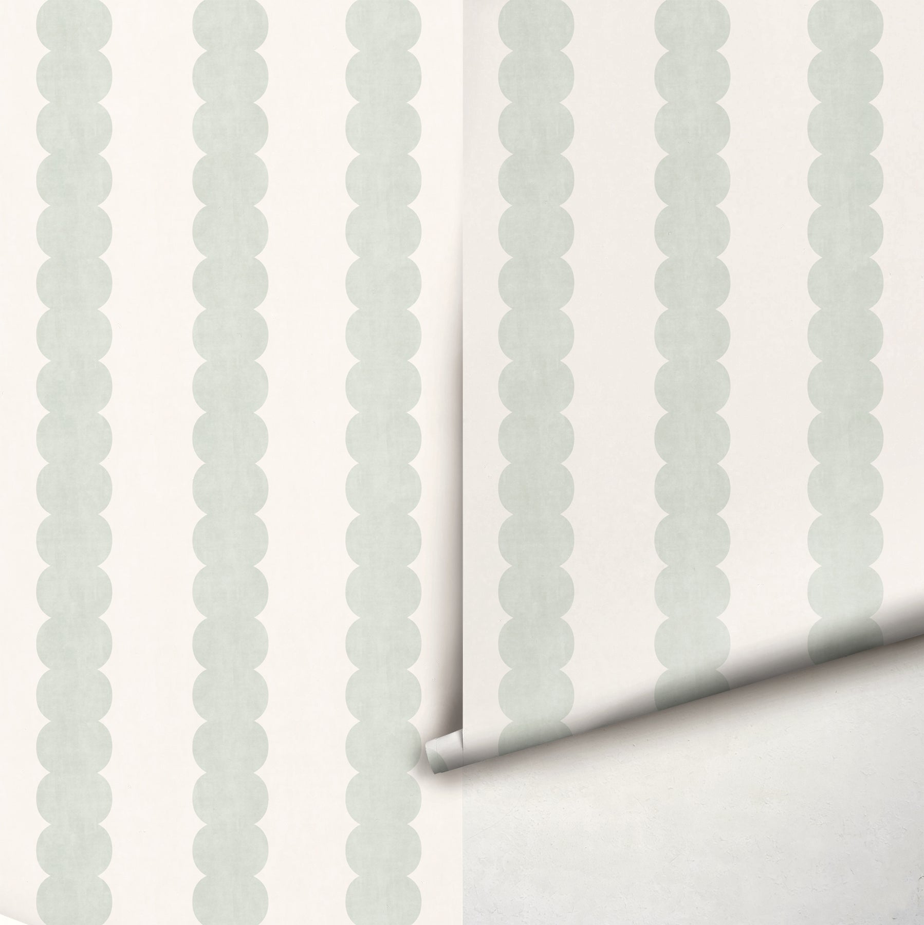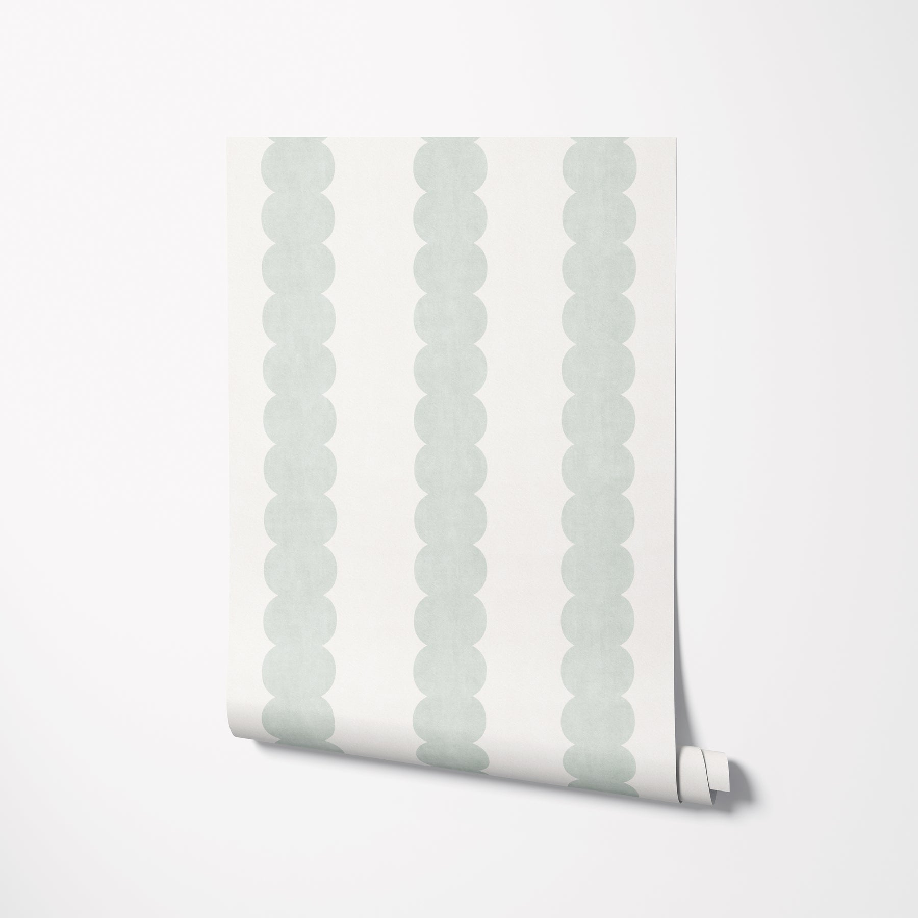 A modern, bold wallpaper featuring a minimal pebble-column design. Each panel is styled with three thick vertical stripes for a strong yet refined statement. Colors are light sage and off white.